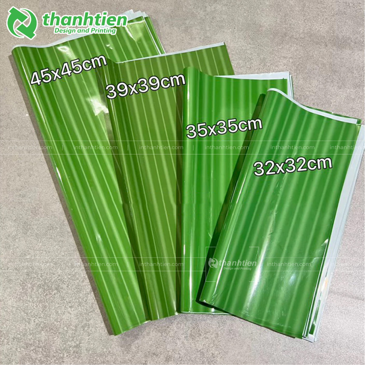 Xưởng Bao Bì In Thành Tiến cung cấp đa dạng kích thước lá chuối giả phù hợp với nhiều nhu cầu sử dụng, từ gói nem, chả lụa, bánh chưng, bánh tét,…Tùy vào số lượng đặt hàng khác nhau từ mỗi khách hàng, sẽ có mức giá tương ứng. Dưới đây là bảng giá, kích thước có sẵn tại Thành Tiến, để Quý Khách hàng dễ theo dõi.
